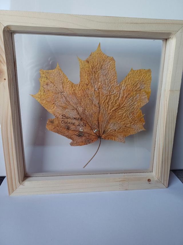 Afin de réalisé cette peinture, la feuille à été séchée au préalable pendant au moins deux semaines dans un pressoir. Une fois la peinture réalisée, la feuille est recouverte d'un spray vernis protection UV mat.