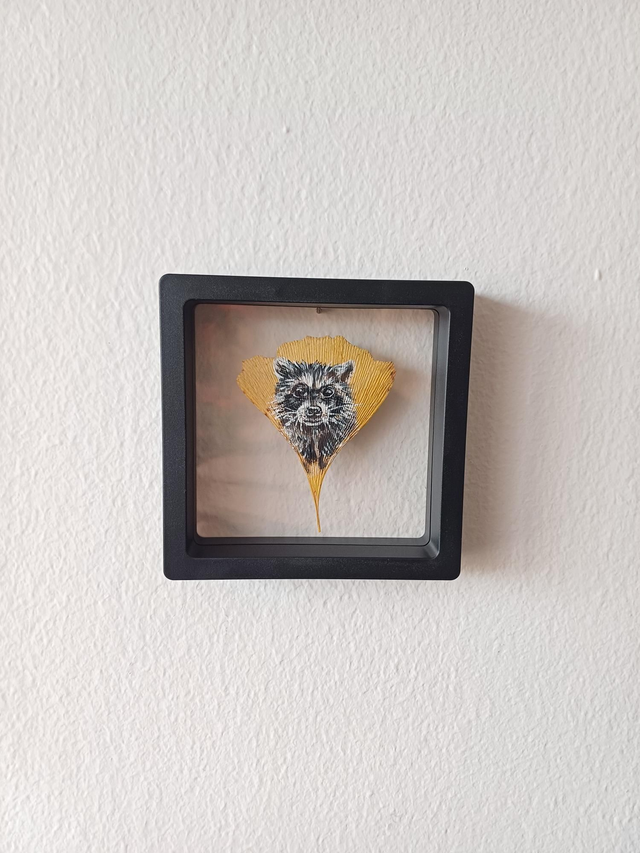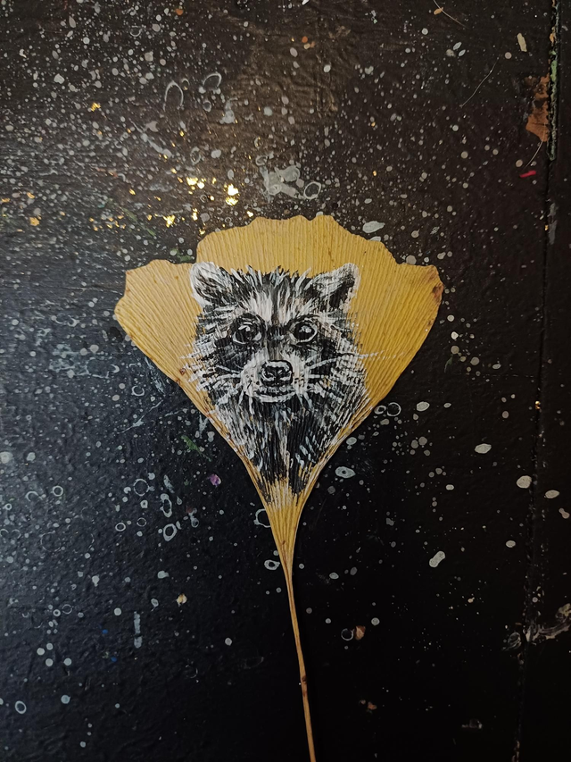 Raton laveur, réalisé en peinture acrylique sur une véritable feuille de Ginko Biloba.
