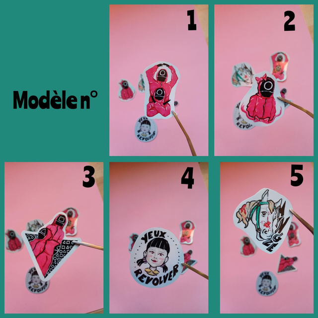 Découvrez nos stickers Squid Game réalisés à la main sur papier holographique. Disponibles à l'unité ou en pack complet, ces autocollants ajoutent une touche unique et brillante à vos accessoires.
