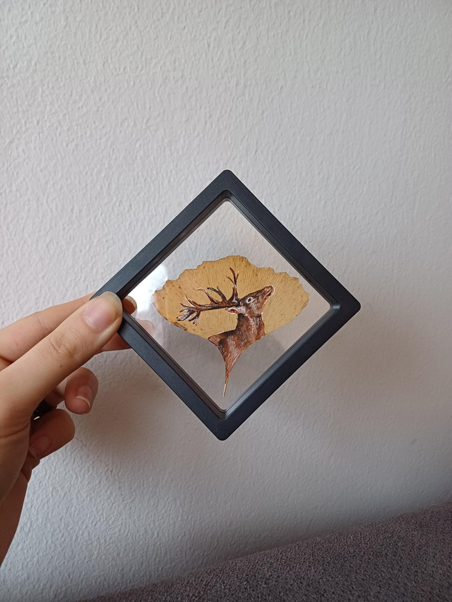 Cerf Ă©laphe, grand cervidĂ© des forĂȘts, rĂ©alisĂ© sur une vĂ©ritable feuille de Ginko Biloba.